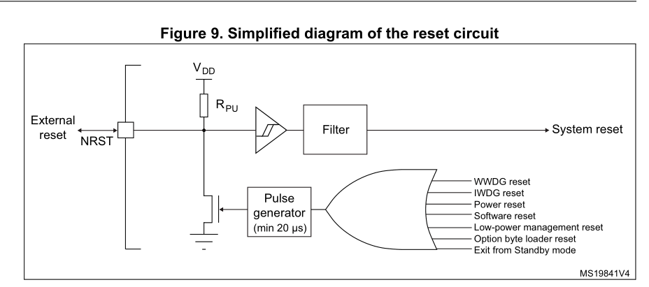 2 手动按键复位原理图,手动按钮复位在GND和RESET之间接一个按钮。当人为按下按钮时, RESET脚就会被GND拉为低电平,使单片机进入复位状态,如果手不松掉,那么会一直处于复位状态,直至手松掉之后,复位引脚电平恢复。下图位ST单片机内部的复位波形,上电的时候VDD大于Vpor并持续一定的时间,单片机脱离复位状态,掉电的时候Vdd电压低于Vpdr电压,单片机进行复位。
