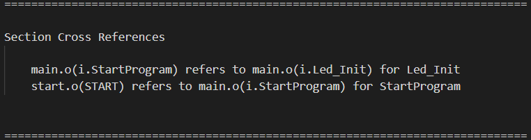 上面这句话,main.omain.c生成的目标文件模块,start.ostart.s生成的目标文件模块,上面这2个含义是:用户在start.o启动代码中调用了__main.o模块中的StartProgram函数,StartProgram又调用了同文件中Led_Init函数。