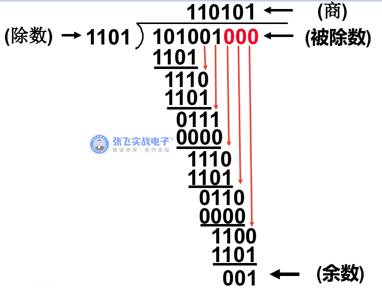 模2除法是模2乘法的逆运算,定义如下:0÷1=0,1÷1=1,类似于普通的多位二进制除法,但是在如何确定商的问题上两者采用不同的规则。普通多位二进制除法按带借位的二进制减法,根据余数减除数够减与否确定商1还是商0,若够减则商1,否则商0。多位模2除法采用模2减法,不带借位的二进制减法,因此考虑余数够不够减除数是没有意义的。实际上,在CRC运算中,总能保证除数的首位为1,则模2除法运算的商是由余数首位与除数首位的模2除法运算结果确定。因为除数首位总是1,按照模2 除法运算法则,那么余数首位是1就商1,是0就商0。例如1011÷101=110101...001,列竖式计算: