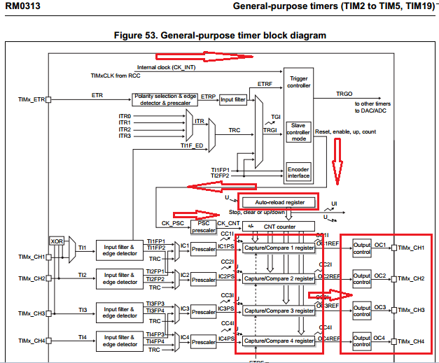 方框内部的CNT Counter计数器会根据输入的时钟沿跳变来进行递加/减,时钟的频率决定了计数器递加/减的频率,这个计数器的值同时会和Auto-reload register(控制周期)、Capture/Compare x register(控制占空比)进行比较,当与控制占空比的寄存器值发生匹配时则控制输出引脚TIMx_CHx发生电平反转,当与控制周期寄存器值发生匹配时,周期结束,引脚电平置位,再次重复如上动作,就在引脚上输出了变化不同的电平,这个就是我们需要的PWM